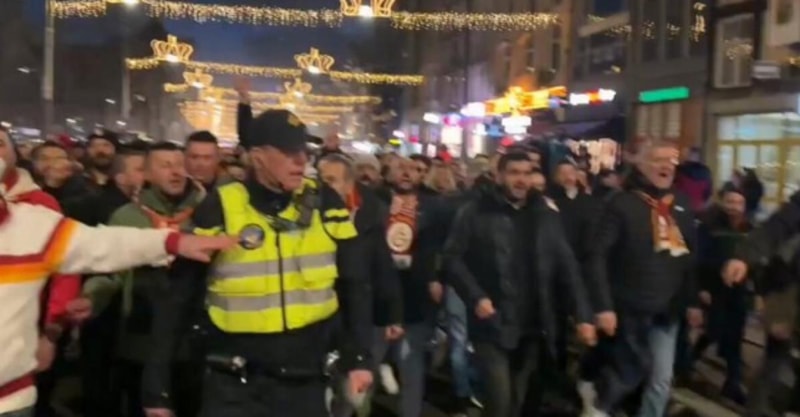 Ajax maçı için Amsterdam kentine gelen sarı kırmızılı taraftarlar, stada yürürken Hollanda polisinin şaşkın bakışları arasında Filistin'e destek sloganları attı, Filistin bayrakları açtı.