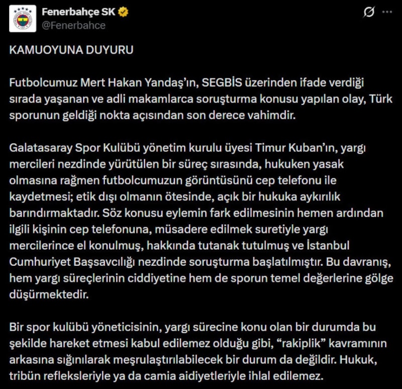 Galatasaray Spor Kulübü yönetim kurulu üyesi Timur Kuban’ın, yargı mercileri nezdinde yürütülen bir süreç sırasında, hukuken yasak olmasına rağmen futbolcumuzun görüntüsünü cep telefonu ile kaydetmesi; etik dışı olmanın ötesinde, açık bir hukuka aykırılık barındırmaktadır. Söz konusu eylemin fark edilmesinin hemen ardından ilgili kişinin cep telefonuna, müsadere edilmek suretiyle yargı mercilerince el konulmuş, hakkında tutanak tutulmuş ve İstanbul Cumhuriyet Başsavcılığı nezdinde soruşturma başlatılmıştır. Bu davranış, hem yargı süreçlerinin ciddiyetine hem de sporun temel değerlerine gölge düşürmektedir.