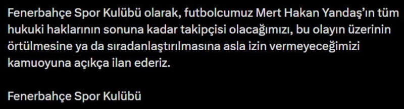 Fenerbahçe Spor Kulübü olarak, futbolcumuz Mert Hakan Yandaş’ın tüm hukuki haklarının sonuna kadar takipçisi olacağımızı, bu olayın üzerinin örtülmesine ya da sıradanlaştırılmasına asla izin vermeyeceğimizi kamuoyuna açıkça ilan ederiz.