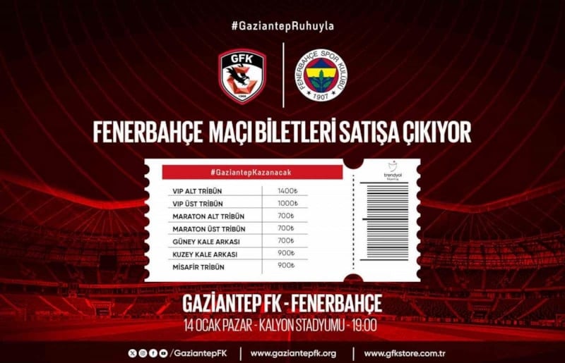 Gaziantep Kalyon Stadı’nda 14 Ocak Pazar günü saat 19.00’da oynanacak maçın biletleri satışa çıktı.