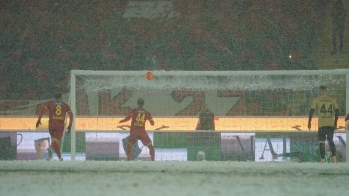 Gaziantep Kalyon Stadyumu'nda maçın ikinci yarısında oyuncular sahaya gelirken hakem Ümit Öztürk zemini kontrol etti ve yoğun kar yağışı nedeniyle mücadele ertelendi.