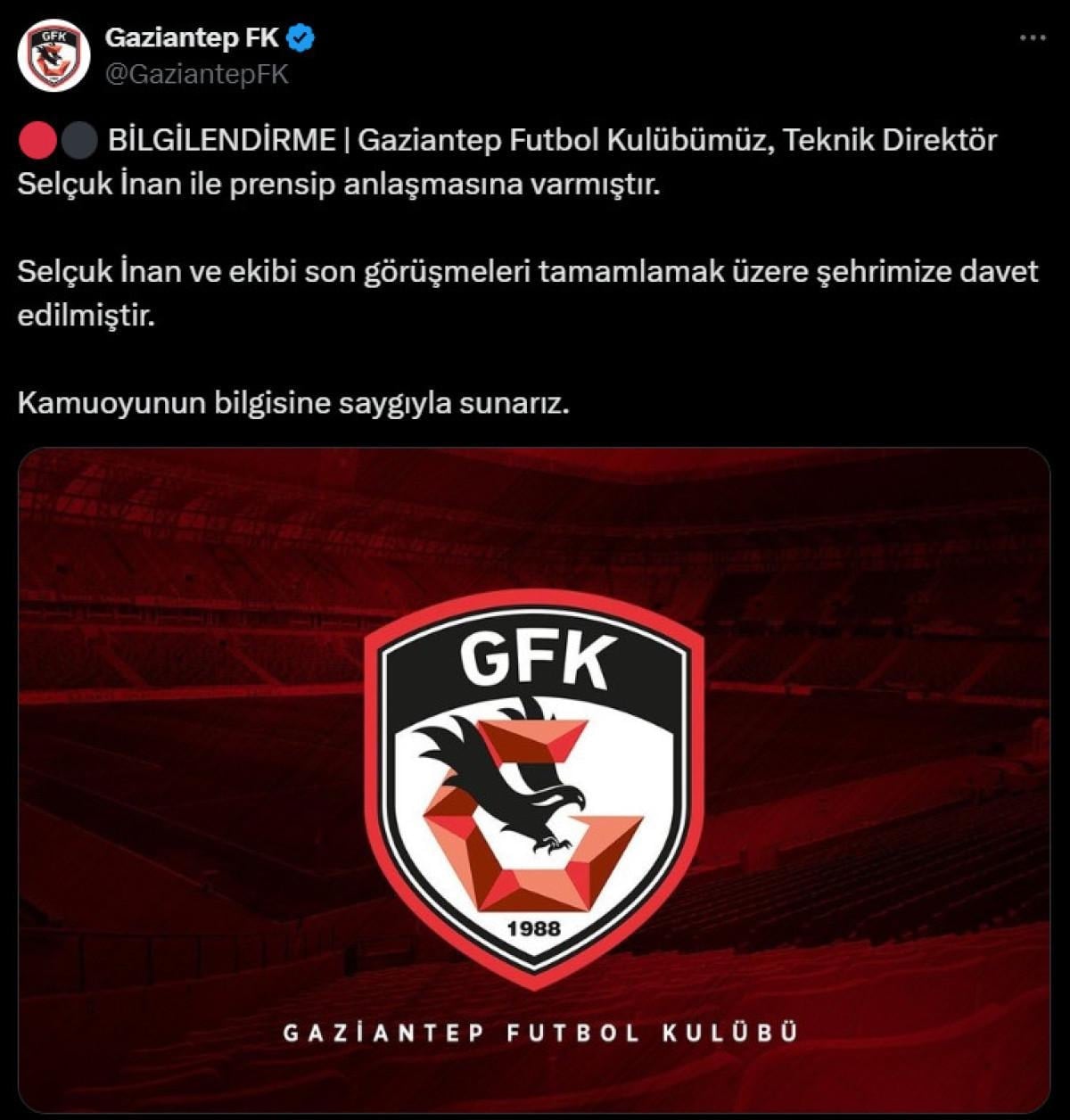 Gaziantep Futbol Kulübümüz, Teknik Direktör Selçuk İnan ile prensip anlaşmasına varmıştır.