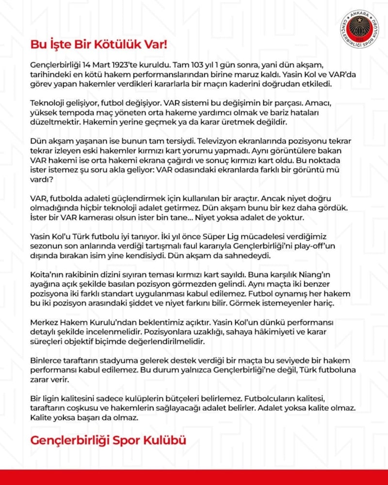 Karşılaşma hakemlerinin performanslarının "tarihin en kötülerinden biri" olarak nitelendirildiği ve "Bu işte bir kötülük var" başlığıyla yapılan kırmızı-siyahlı kulübün yazılı açıklamasında, "Gençlerbirliği 14 Mart 1923'te kuruldu. Tam 103 yıl 1 gün sonra, yani dün akşam, tarihindeki en kötü hakem performanslarından birine maruz kaldı. Yasin Kol ve VAR'da görev yapan hakemler, verdikleri kararlarla bir maçın kaderini doğrudan etkiledi." denildi.