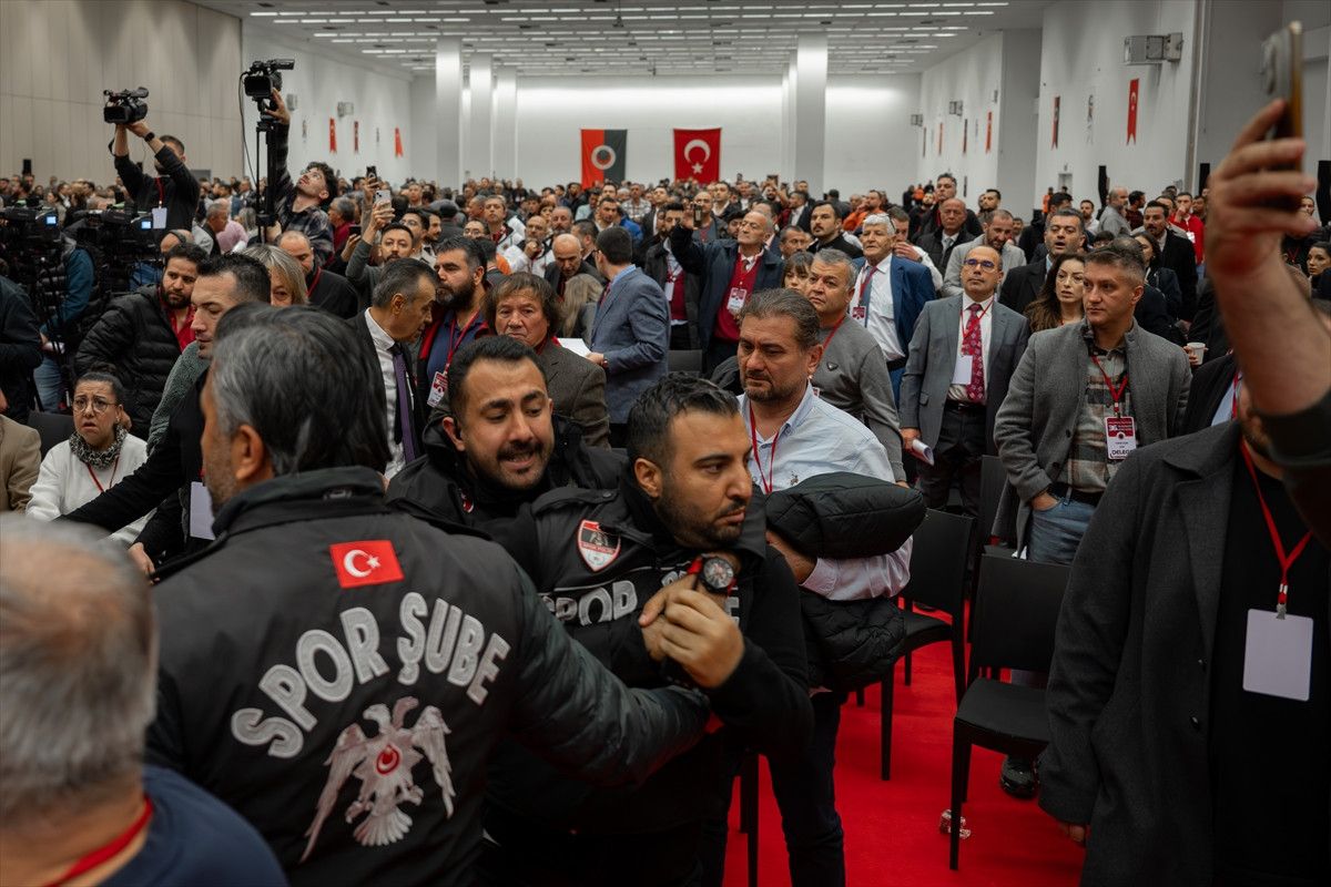 Hemen ardından kırmızı-siyahlı kulübün mevcut başkanı Mehmet Kaya'nın konuşmasını yapması için kürsüye geldiği sırada salonda arbede yaşandı.