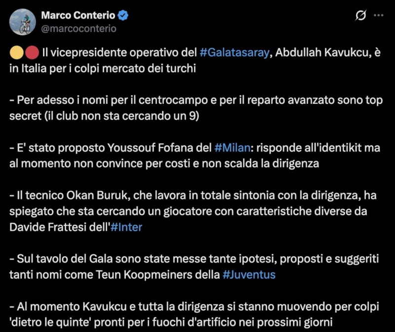 Menajer George Gardi'ye yakınlığıyla bilinen İtalyan gazeteci Marco Conteiro, Galatasaray'ın İtalya'daki transfer şifrelerini aktardı. Conteiro, sarı-kırmızılıların gündeminde olan oyuncularla ilgili o yazı sizlerle...