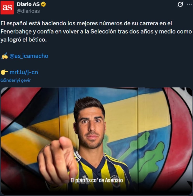 Asensio'nun, milli takıma geri dönmek istediği belirtildi ve "Marco Asensio, Fenerbahçe'de kariyerinin en iyi istatistiklerini elde ediyor ve 2,5 yıl sonra milli takıma geri döneceğinden emin." ifadeleri yer aldı.