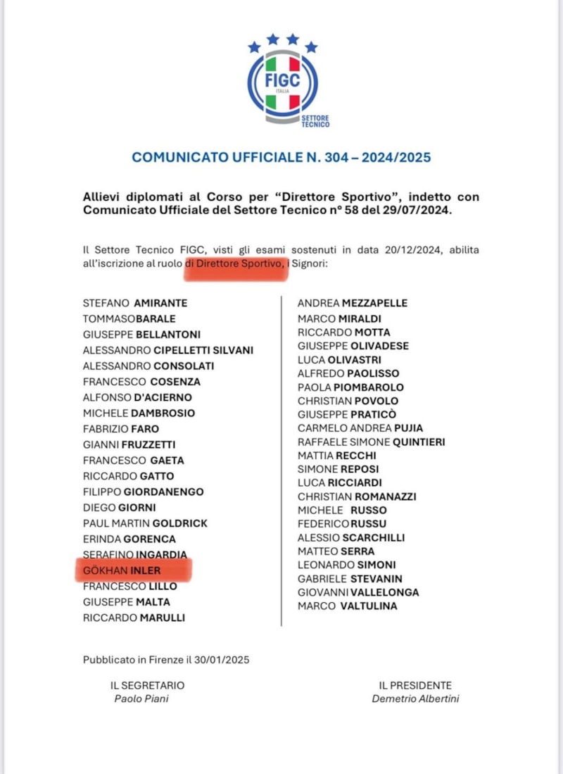 İnler'e Sportif Direktörlük belgesi İtalya Futbol Federasyonu'nda düzenlenen törenle bugün teslim edildi.