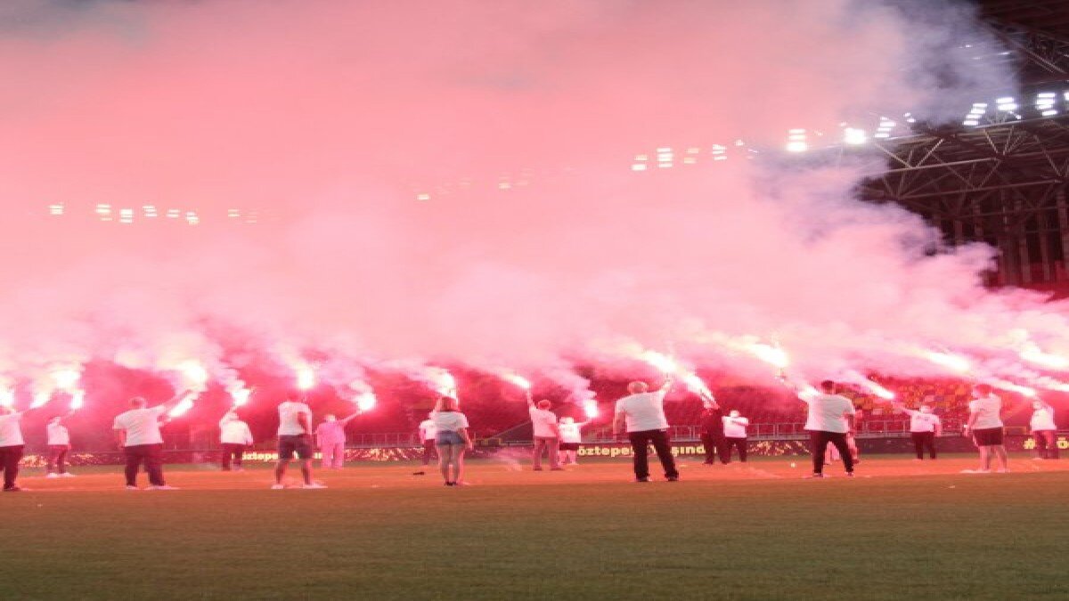 Saatler 22.00’yi gösterdiğinde ışık ve müzik gösterileriyle birlikte stadın çatısındaki yürüyüş parkuruna yerleştirilen insansız ateşleme sistemiyle Göztepe’nn kuruluş yılını simgeleyen bin 925 adet meşale yakıldı.