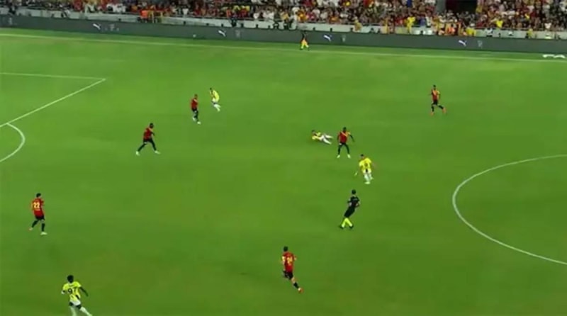 Bahattin Duran: Devam kararı doğru hocam. Arka tarafta Mert Müldür'ün olduğu pozisyon. Rakibin ayağına temas etmiyor. Uzanan ayağa Göztepeli oyuncu da gitmek istiyor ve çarpıyorlar ama topa ulaşmasını engellemiyor. Devam kararı doğru.