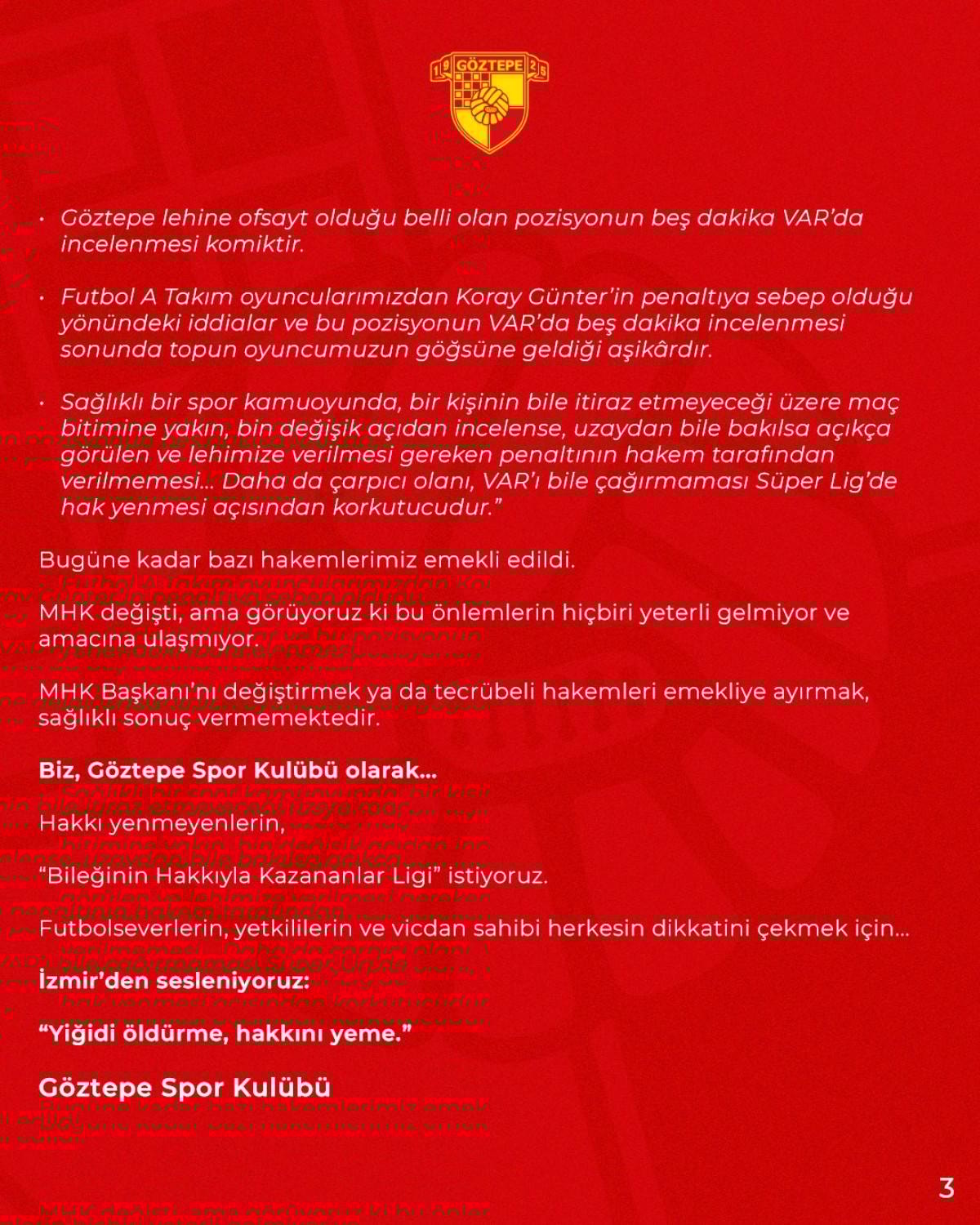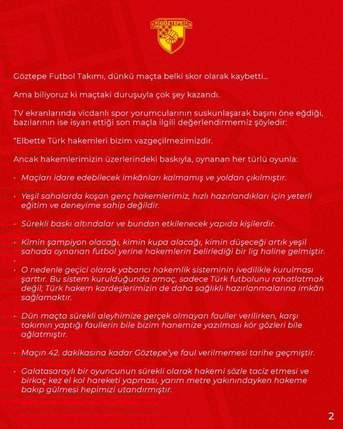 Göztepe'nin yaptığı açıklamada, "Bileğinin hakkıyla kazananlar ligi istiyoruz." ifadeleri dikkat çekti.
