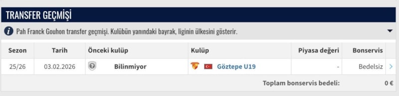 Göztepe'nin kadrosuna kattığı 19 yaşındaki Pah Franck Gouhon'un önceki kulübüne dair herhangi bir bilginin bulunmaması, görenleri şaşkına çevirdi.