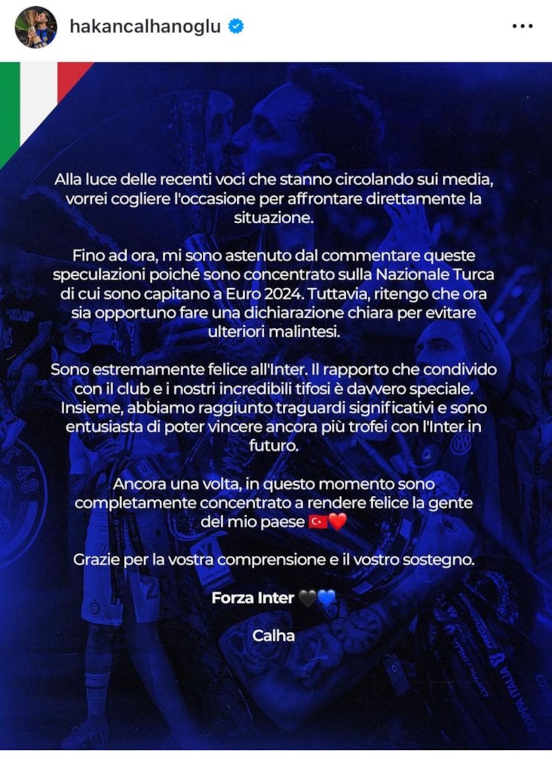 Sosyal medya hesabından açıklama yapan Hakan Çalhanoğlu, takımı Inter'de yola devam edeceğini yazdı.