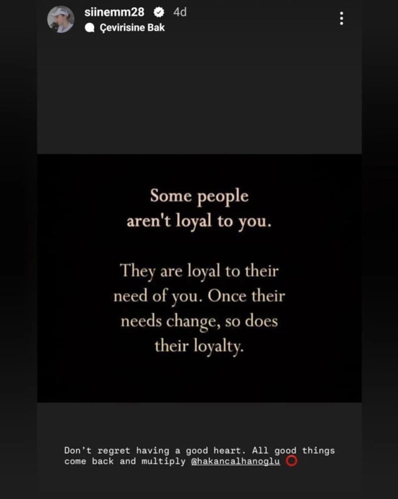 Instagram hikayesinde "Bazı insanlar sana değil, sana olan ihtiyaçlarına sadıktır. İhtiyaçları değiştiğinde, sadakatleri de değişir." sözünü paylaşan Sinem Çalhanoğlu'nun gönderideki notu ise şöyle: