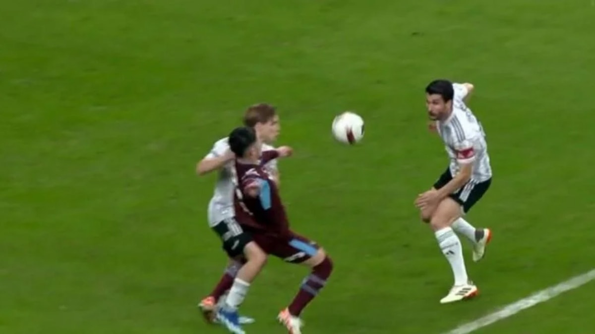 Maçın hakemi Arda Kardeşler, bu pozisyon için olabilecek en kötü yerde kalmış. Varsa formadan çekme varsa diz var. Arda baktığı yerden sadece Trabzonsporlu oyuncuyu görüyor. Daha iyi yerde olmak için de kendini zorlamamış. Açıkça formadan çekme var. Tek başına çekme olsa denge bozmuyor diyebilirim. Formadan çekti, bu sırada dizi kalçasına vuruyor, bir oyuncu topu göğsüne göre ayarlamaya çalışırken dengesi bozuluyor. Bu hareketin bütünü tartışmasız ve açık bir penaltı.