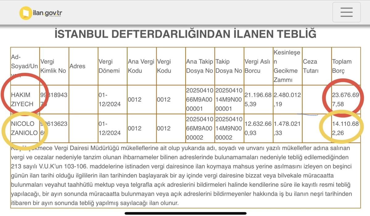ZIYECH VE ZANIOLO'NUN VERGİ BORCU ORTAYA ÇIKTI