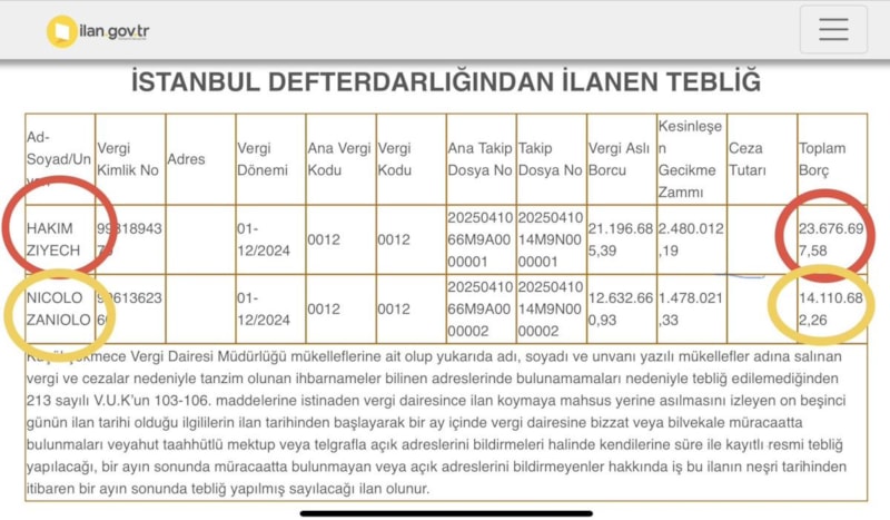 İstanbul Deftedarlığı'nın verdiği ilanla Hakim Ziyech ile Nicolo Zaniolo’nun toplam 38 milyon TL vergi borçları ortaya çıktı. Ödeme yapılmazsa icra süreci başlatılacak.