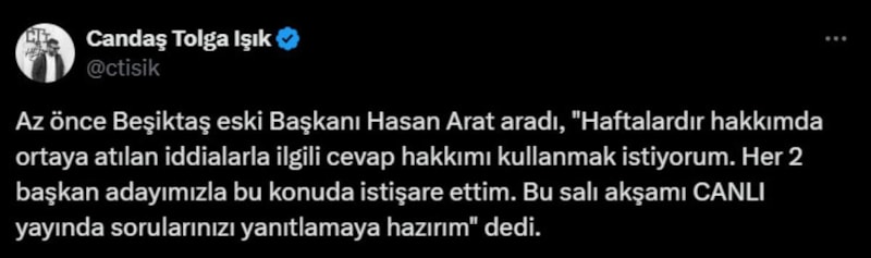 Haftalardır hakkımda ortaya atılan iddialarla ilgili cevap hakkımı kullanmak istiyorum. Her 2 başkan adayımızla bu konuda istişare ettim. Bu salı akşamı canlı yayında sorularınızı yanıtlamaya hazırım.