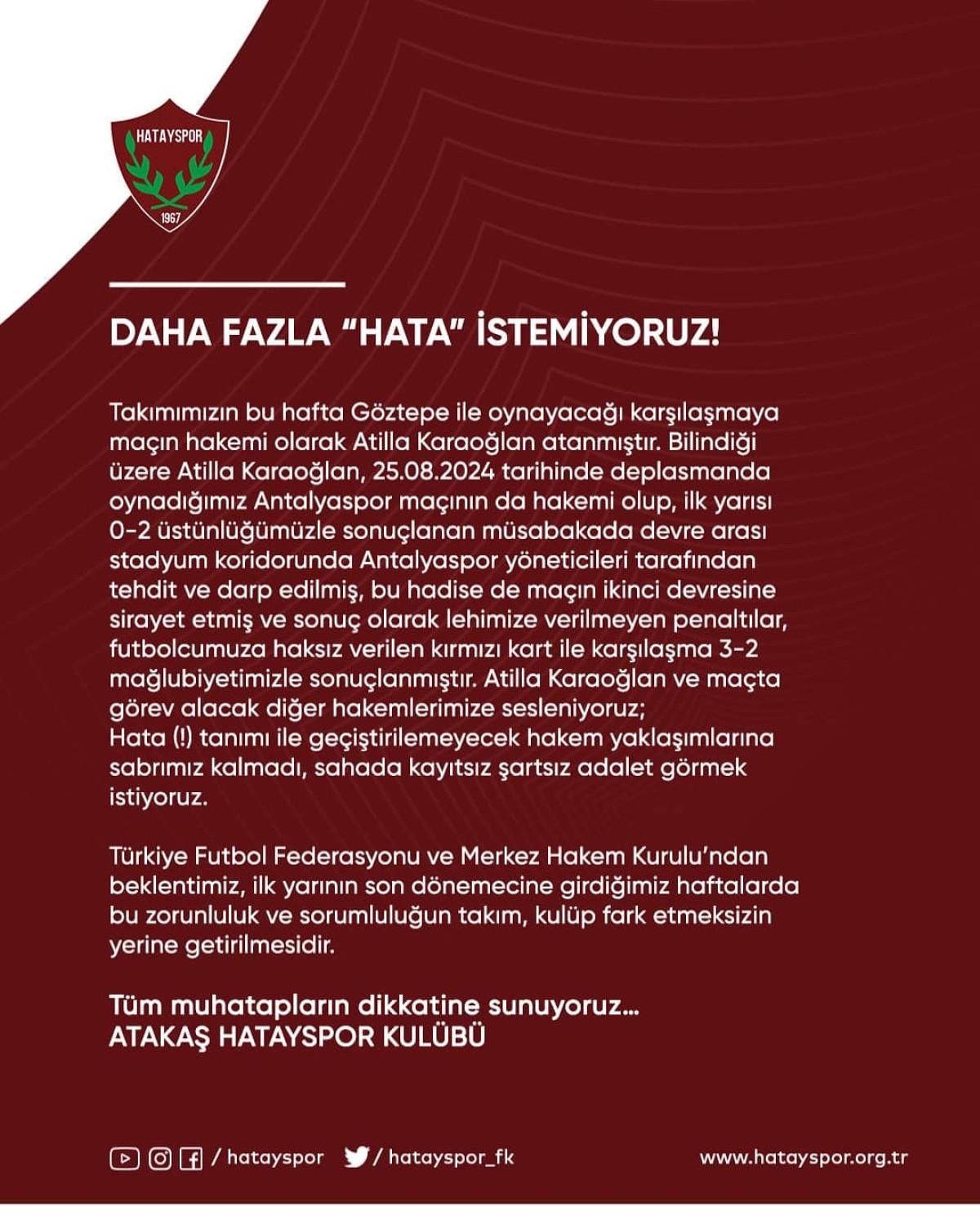 Takımımızın bu hafta Göztepe ile oynayacağı karşılaşmaya maçın hakemi olarak Atilla Karaoğlan atanmıştır. Bilindiği üzere Atilla Karaoğlan, 25 Ağustos tarihinde deplasmanda oynadığımız Antalyaspor maçının da hakemi olup, ilk yarısı 0-2 üstünlüğümüzle sonuçlanan müsabakada devre arası stadyum koridorunda Antalyaspor yöneticileri tarafından tehdit ve darp edilmiş, bu hadise de maçın ikinci devresine sirayet etmiş ve sonuç olarak lehimize verilmeyen penaltılar, futbolcumuza haksız verilen kırmızı kart ile karşılaşma 3-2 mağlubiyetimizle sonuçlanmıştır. Atilla Karaoğlan ve maçta görev alacak diğer hakemlerimize sesleniyoruz, hata tanımı ile geçiştirilemeyecek hakem yaklaşımlarına sabrımız kalmadı, sahada kayıtsız şartsız adalet görmek istiyoruz. Türkiye Futbol Federasyonu ve Merkez Hakem Kurulu'ndan beklentimiz, ilk yarının son dönemecine girdiğimiz haftalarda bu zorunluluk ve sorumluluğun takım, kulüp fark etmeksizin yerine getirilmesidir. Tüm muhatapların dikkatine sunuyoruz.