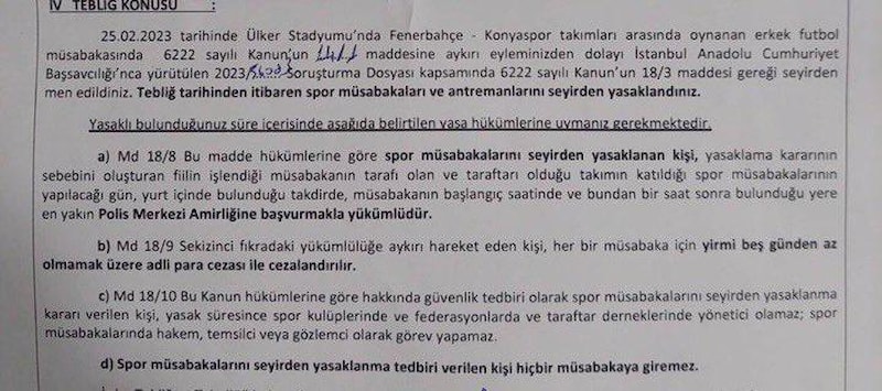 Fenerbahçe Spor Kulübü Kongre üyesi Hasan Doğan, sosyal medya hesabından yaptığı paylaşımda, “Hükümet istifa” tezahüratı yapan taraftarların evlerine 6222 sayılı kanun kapsamında, “spor müsabakalarından men” tebligatı gitmeye başladığını belirtti.
