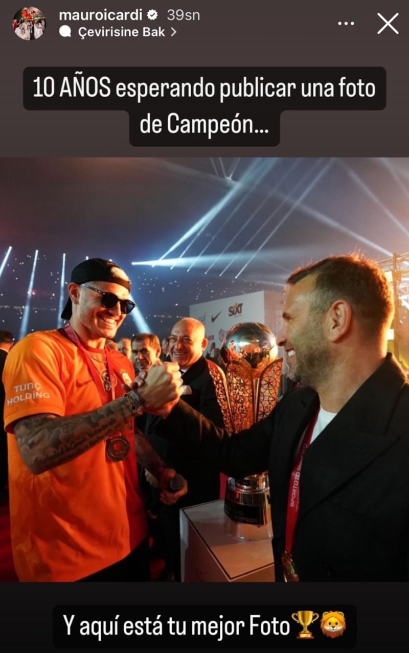 Şampiyonluk kutlamalarından teknik direktör Okan Buruk ile fotoğrafını paylaşan Icardi, şu ifadeleri yazdı: