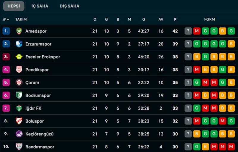 1. LİG'DE PUAN DURUMU