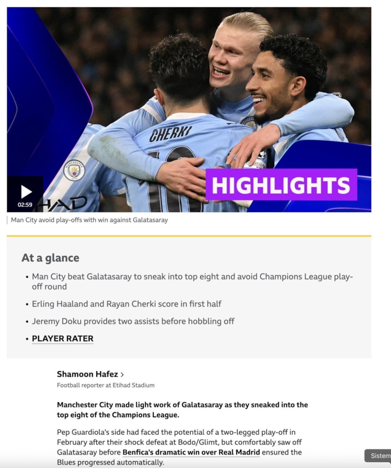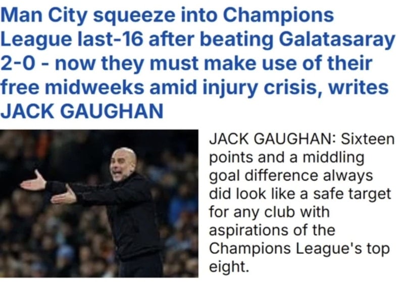 "Manchester City 2-0 Galatasaray: Doku'nun her iki golün de asistini yaptığı maçta Pep Guardiola'nın öğrencileri, Jose Mourinho'nun Benfica'sının Real Madrid'i yenmesiyle son 16'ya zar zor yükseldi. City profesyoneldi, zaferleri etkileyiciydi, ancak Galatasaray'ın etkisizliğinden de faydalandılar."