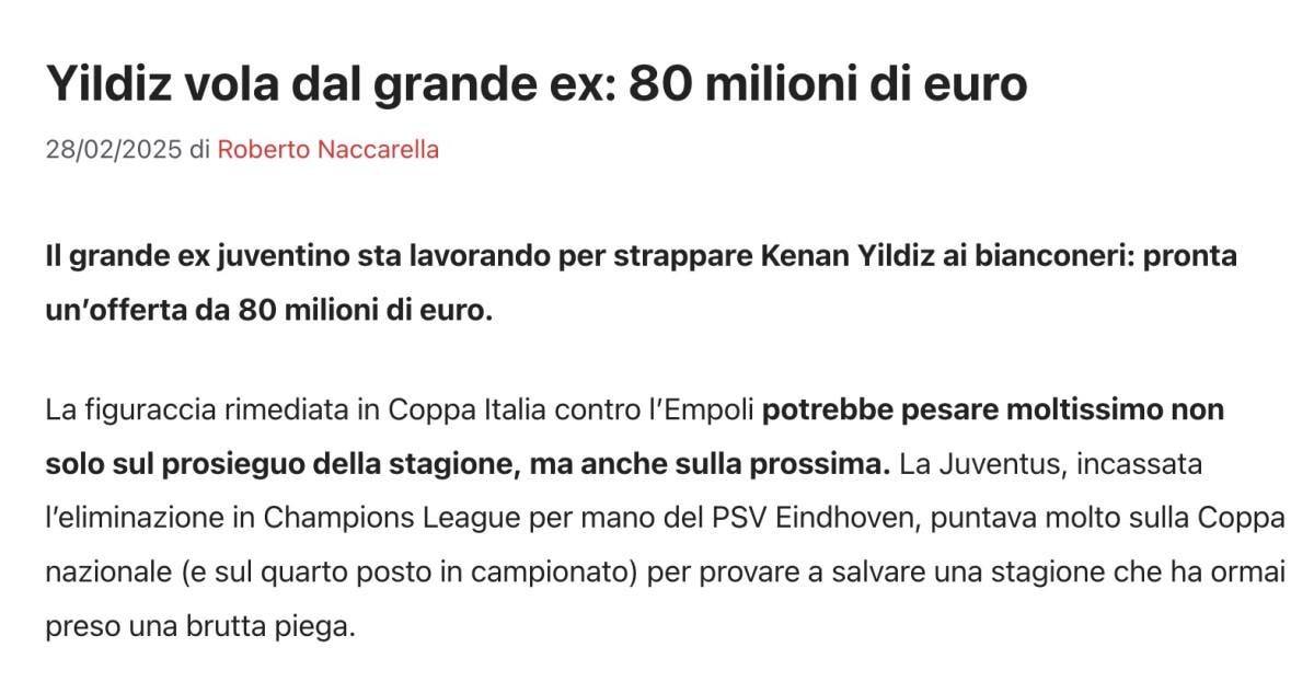 Calciomercato'nun haberine göre, Juventus kulübü, genç oyuncusunun transferi için yaklaşık 80 milyon euroluk bir bedel talep etti.