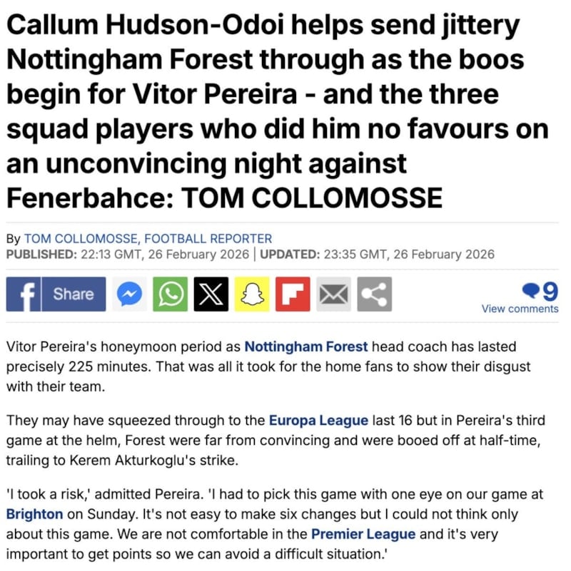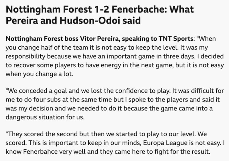 Avrupa Ligi son 16 turuna zar zor yükselmiş olabilirler ancak Pereira'nın teknik direktörlük görevindeki üçüncü maçında Forest, hiç de ikna edici bir performans sergileyemedi. Devre arasında taraftarlar tarafından yuhalandı.