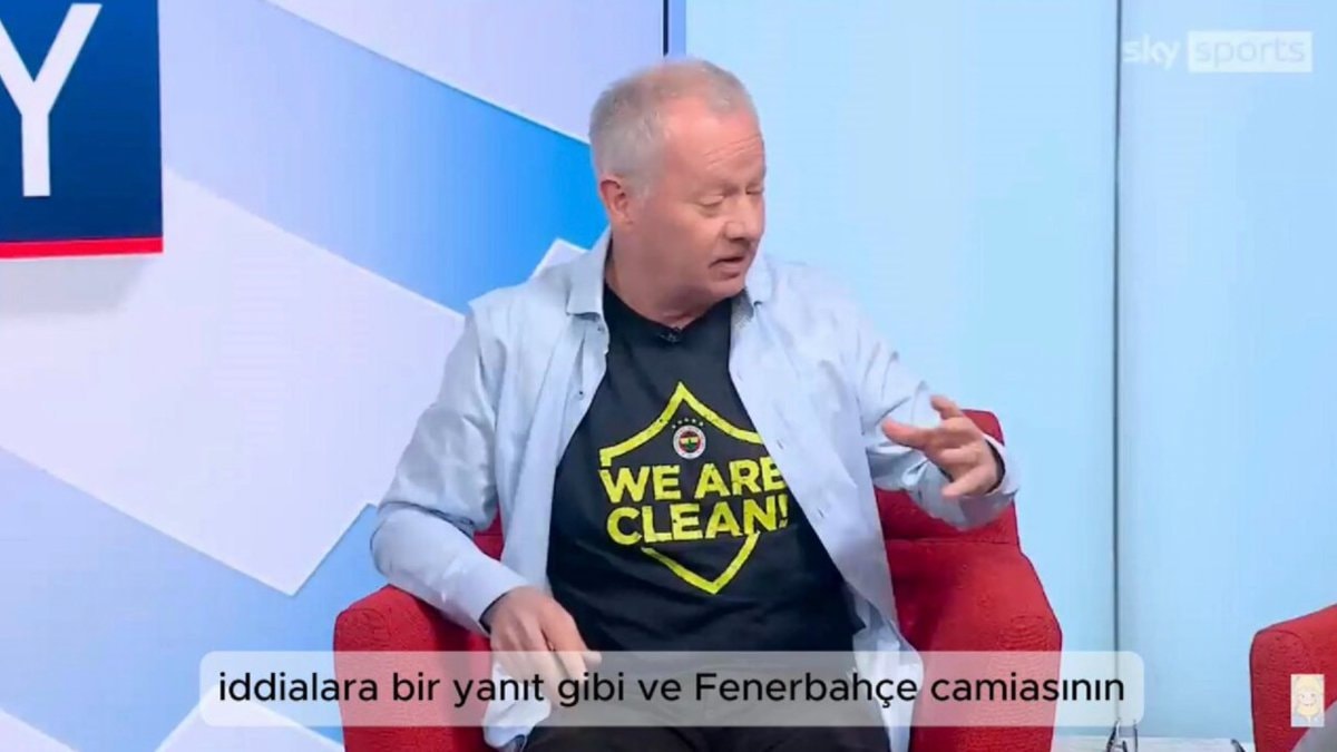 İngiliz gazeteci Gary Cotterill, Sky Sports'ta canlı yayına Fenerbahçe'nin mağazası olan Fenerium tarafından üretilen We are Clean sözleri ile çıktı.