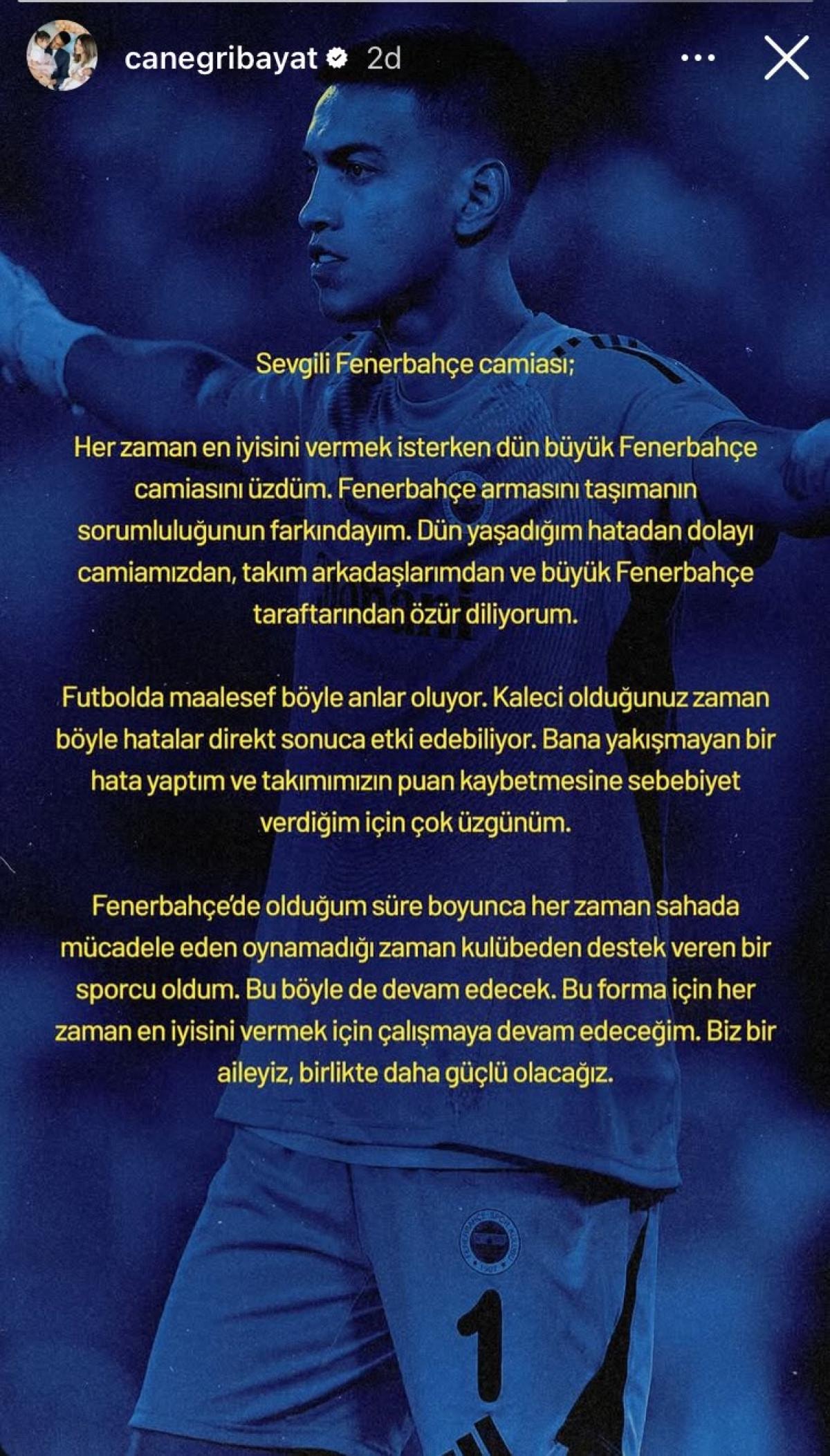 Sarı-lacivertlilerde kaleci İrfan Can Eğribayat, uzatma dakikalarında yenilen golde yaptığı büyük hata nedeniyle takımı puan kaybı yaşarken bugün sosyal medya hesabından konuya dair paylaşımda bulundu.