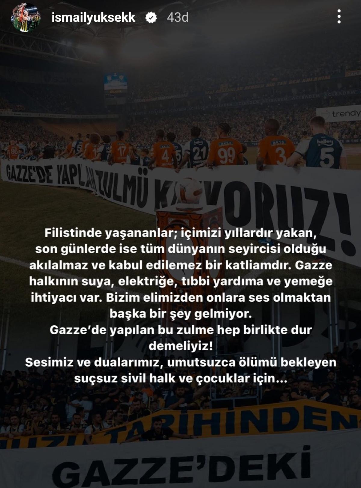 Masum sivilleri katleden İsrail, her geçen güne katliamlarına yenilerini eklerken Fenerbahçe'nin başarılı futbolcusu İsmail Yüksek de bu zulme sessiz kalamayanlardan oldu.