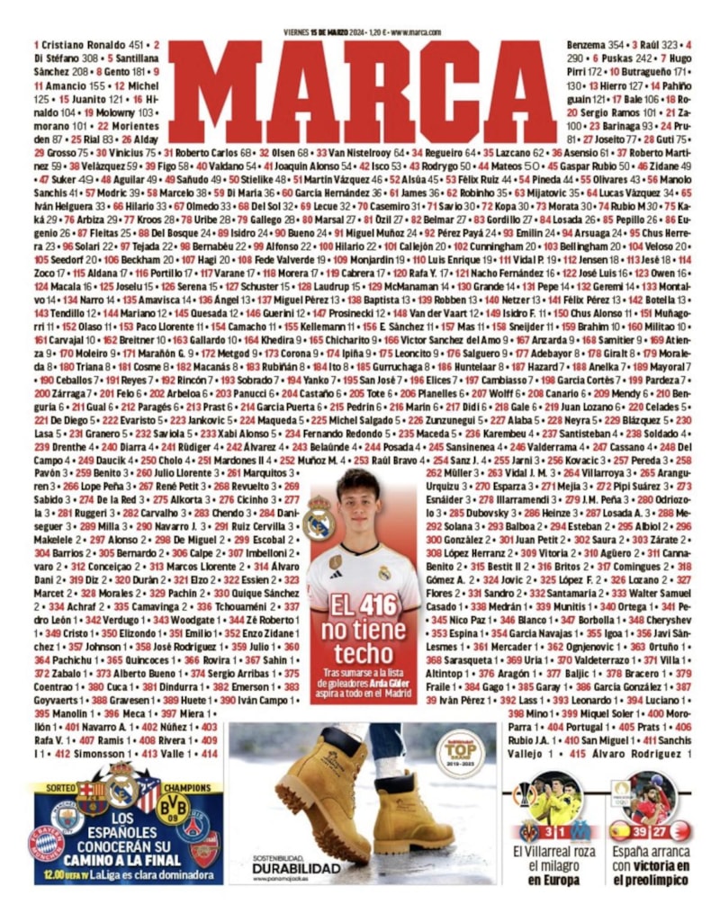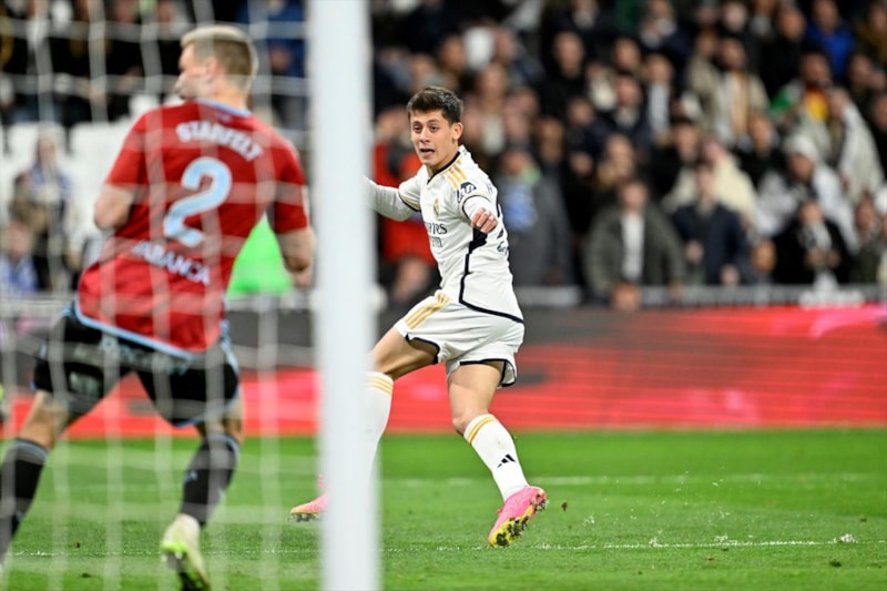 Real Madrid forması giyen Arda Güler, Celta Vigo maçıyla kulüp tarihinde gol atan 416. futbolcu oldu. İspanyol gazetesi Marca, bugünkü sayısında Arda Güler'e manşette yer verdi.