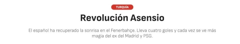 Son dönemde performansıyla dikkatleri üzerine çeken Marco Asensio, Fenerbahçe formasıyla göz doldurmaya başladı. İspanyol futbolcunun ortaya koyduğu oyun ülkesinin basını AS gazetesi tarafından, "Asensio, Fenerbahçe’de devrim yaptı" başlığıyla verildi...