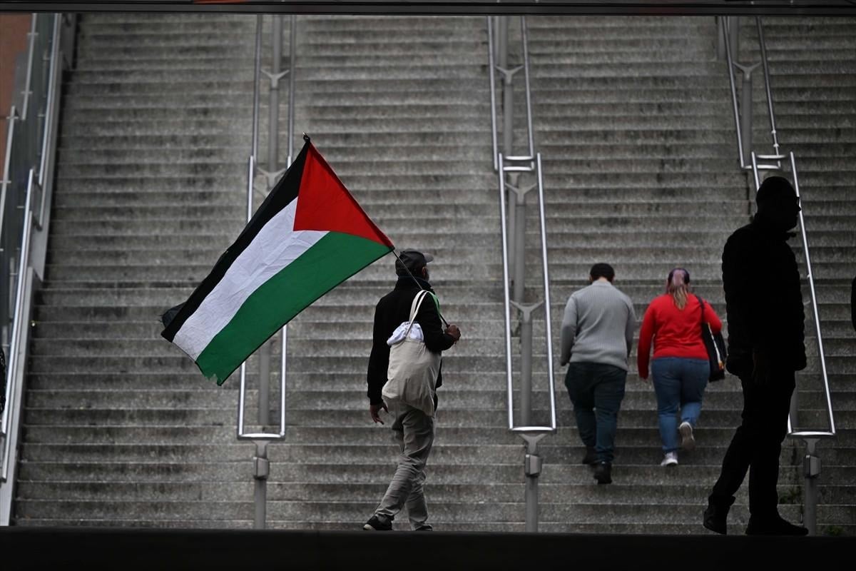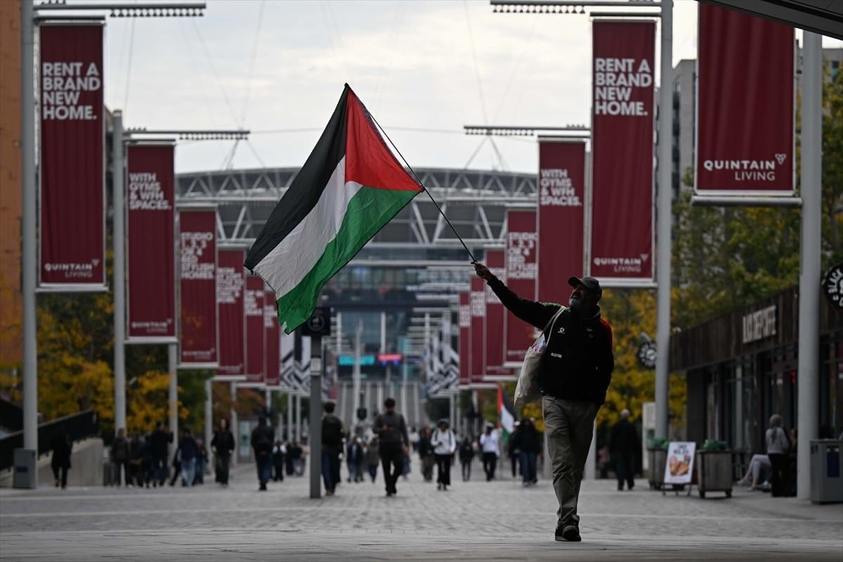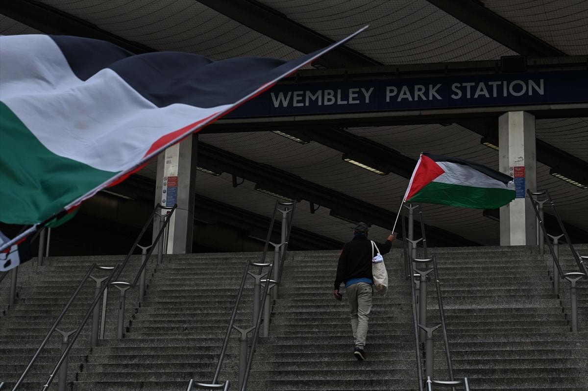 İngiltere'nin başkenti Londra'daki Wembley Stadı önünde toplanan grup, "İsrail'i FIFA'dan atın", "Filistin'e adalet", "İsrail'i boykot edin", "Yaşasın özgür Filistin" sloganları atarak Filistin bayraklarıyla yürüyüş gerçekleştirdi.