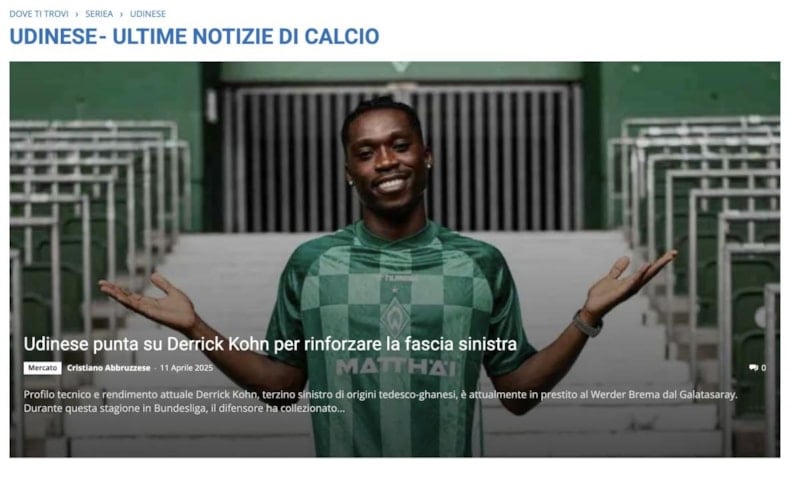 Galatasaray'dan Werder Bremen'e kiralanan Derrick Köhn, performansıyla Avrupa kulüplerinin dikkatini çekti. Bundesliga'da 23 maça çıkan defans oyuncusu için Udinese devreye girdi.