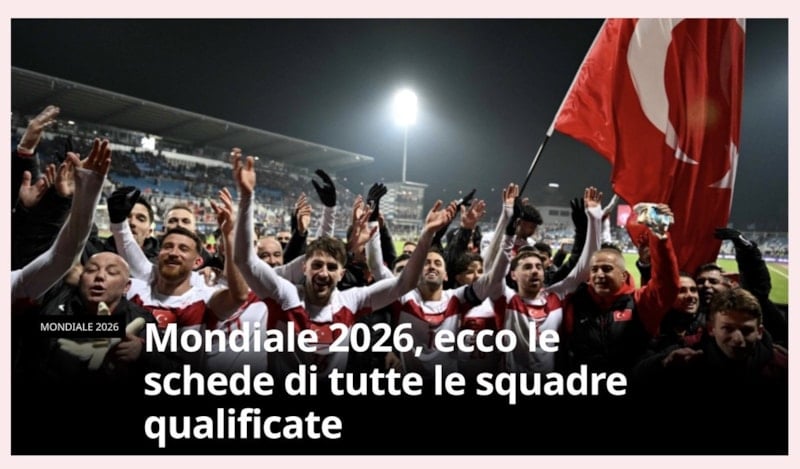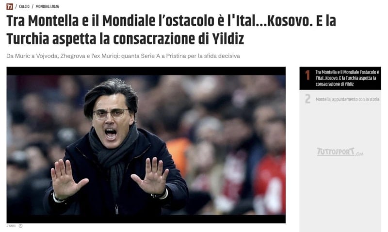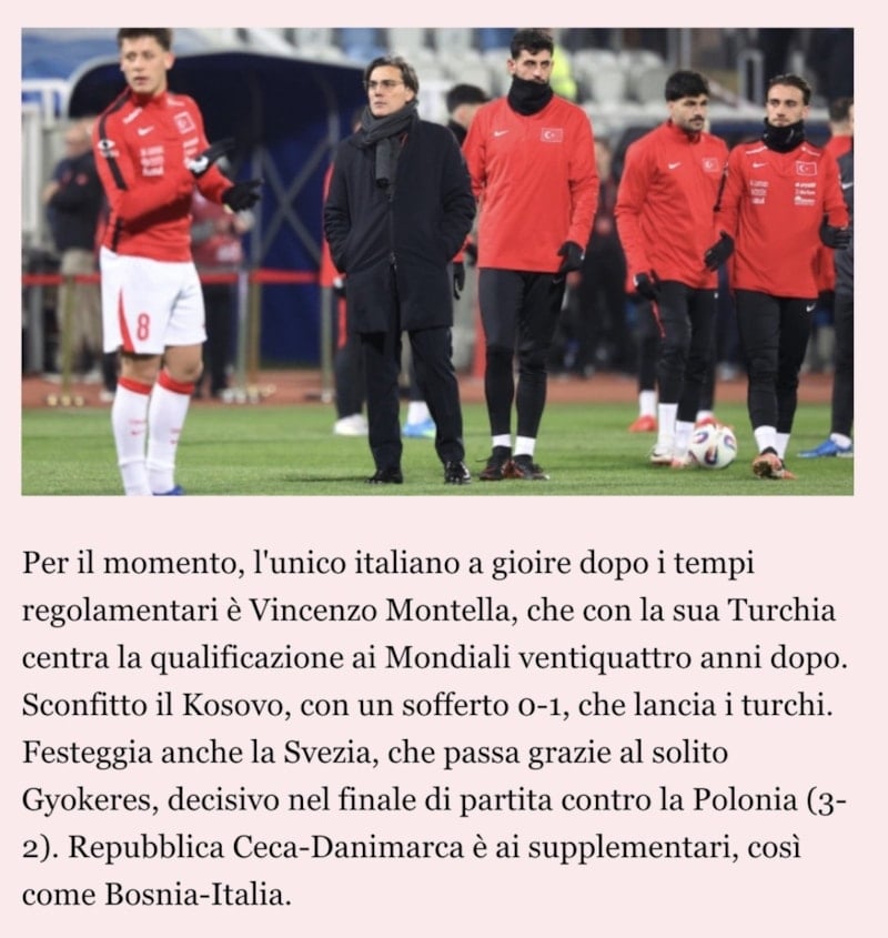 2026 FIFA Dünya Kupası Avrupa Elemeleri'nde play-off turu final maçlarında İtalya'nın Bosna Hersek'e penaltı atışlarında elenmesi, diğer taraftan ise Vincenzo Montella yönetimindeki A Milli Takım'ın ise Kosova'yı 1-0 yenerek Dünya Kupası bileti alması, İtalyan basınında geniş yankı buldu.