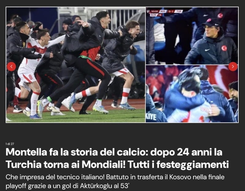 La Gazzetta dello Sport, diğer taraftan Türkiye'yi 24 yıl sonra Dünya Kupası finallerine taşıyan İtalyan teknik adam Vincenzo Montella'ya dikkati çekerek, "Montella cennette. Yıldız parlıyor, Aktürkoğlu atıyor, Türkiye Amerika'da" başlığını kullandı.