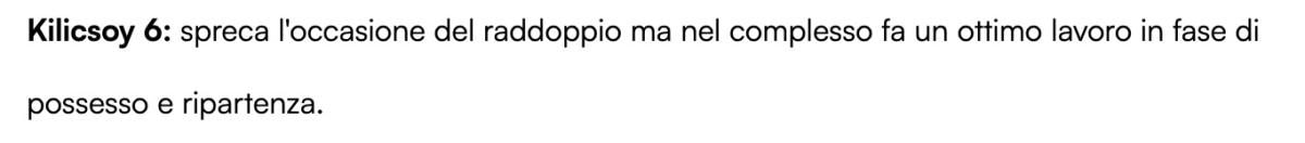 "Pisacane ilk dakikada ona kritik bir şans verdi, ancak bunu değerlendiremedi. Özellikle ilk yarıda farkı ikiye katlayabilecek bir şutu isabetsiz buldu."