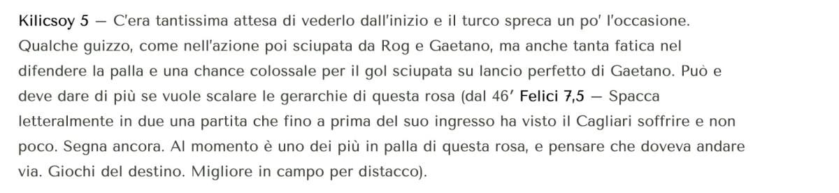 Karşılaşmanın ardından Semih Kılıçsoy için İtalyan basınında yapılan yorumlarda, Türk forvetin kendisine verilen şansı iyi kullanamadığı ileri sürüldü.