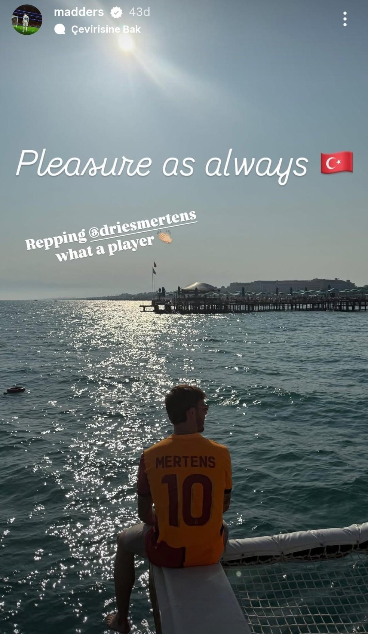 Maddison, sosyal medya hesabından yaptığı bir diğer paylaşımda Dries Mertens'in Galatasaray formasıyla çekilmiş bir fotoğrafını paylaşarak, "Mertens ne oyuncu ama" paylaşımı yaptı.