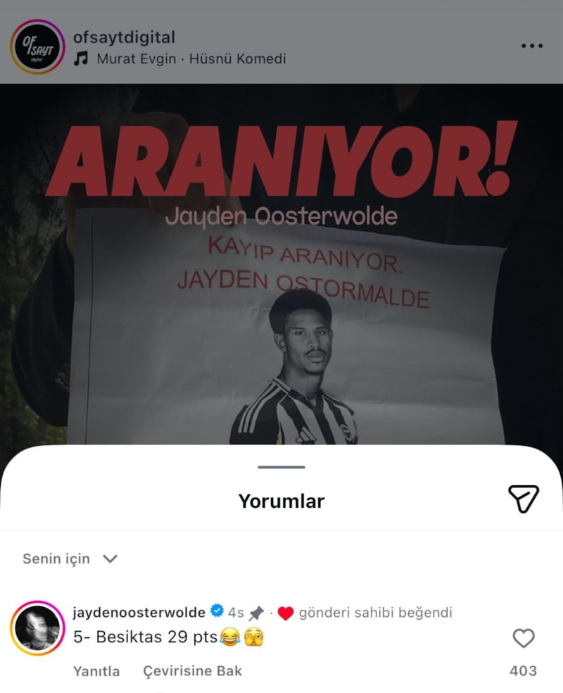 Fenerbahçeli Jayden Oosterwolde, kendi için yapılan 'Kayıp aranıyor' paylaşımının altına "Beşiktaş 29 puanla 5. sırada" yorumunda bulundu.