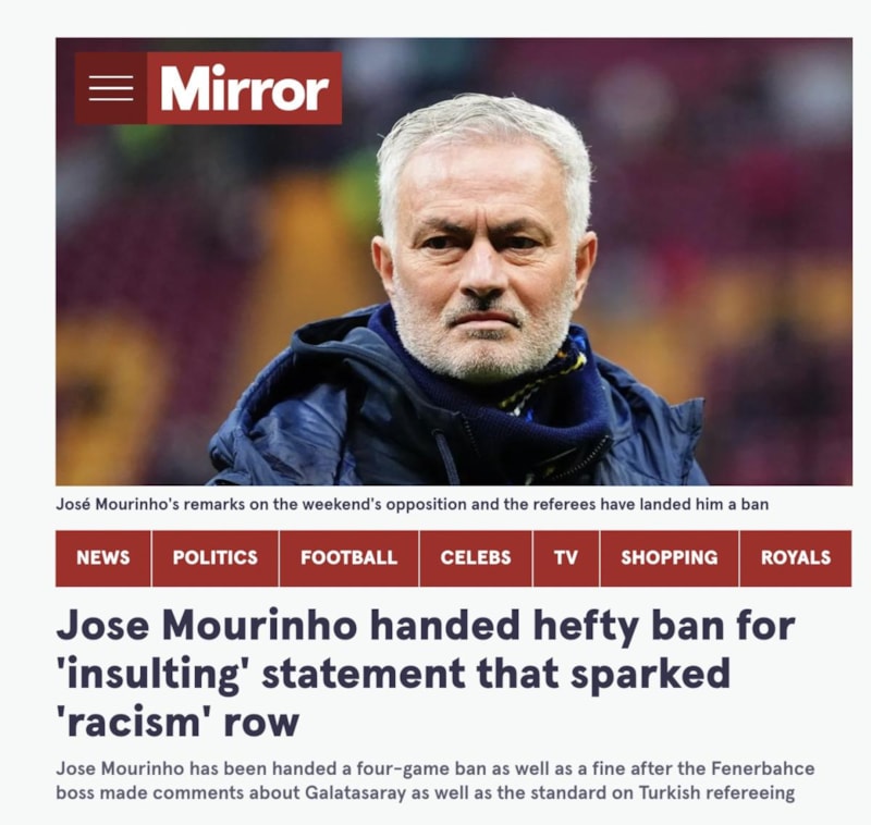 "Jose Mourinho, 'ırkçılık' tartışmalarını alevlendiren 'hakaret' içeren açıklamaları nedeniyle ağır bir ceza aldı. Fenerbahçe teknik direktörü, Galatasaray ve Türk hakemliği hakkında yaptığı yorumların ardından 4 maç ceza ve ek olarak para cezasına çarptırıldı."