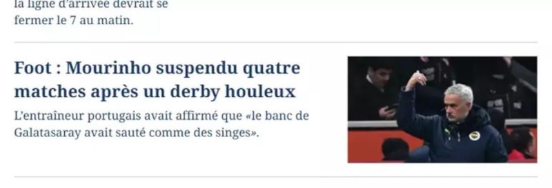 Galatasaray deplasmanından 0-0'lık beraberlikle ayrılan Fenerbahçe'nin teknik direktörü Jose Mourinho'nun maç sonu düzenlenen basın toplantısında kullandığı ifadeler sonrası 4 maç men cezası aldığı açıklanmıştı. Dünya basını, Portekizli çalıştırıcının cezasını değerlendirdi.