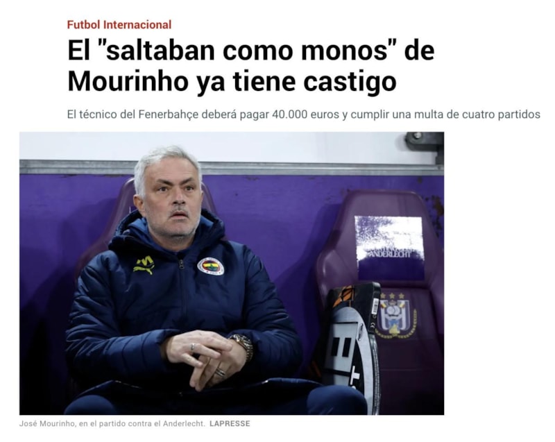 "Jose Mourinho'nun 'Maymun gibi zıpladılar' açıklaması cezasını buldu. Fenerbahçe Teknik Direktörü, 40 bin euro para cezası ödeyecek ve 4 maçtan menedilecek."