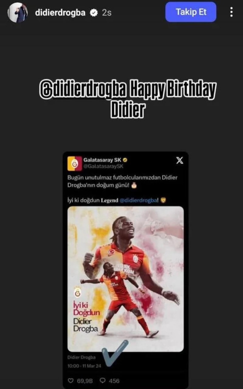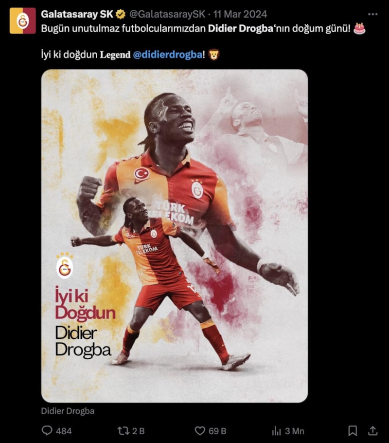 Galatasaray Kulübü, geçtiğimiz yıl Drogba'nın doğum gününü "Unutulmaz futbolcumuz Didier Drogba'nın doğum günü!" ifadeleriyle kutlamıştı.