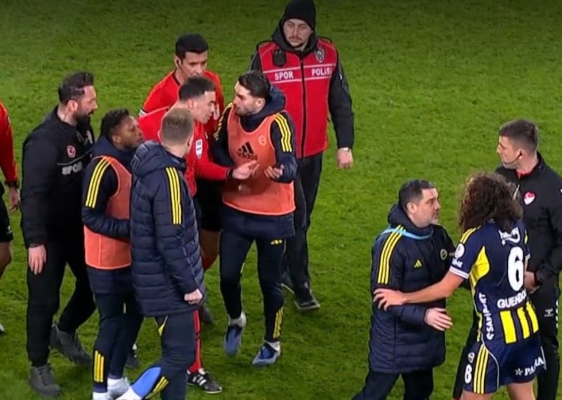 Fenerbahçeli futbolcular, hakem Oğuzhan Çakır'a itirazda bulundu. Hakem Oğuzhan Çakır, oyunun sürmesini istedi.