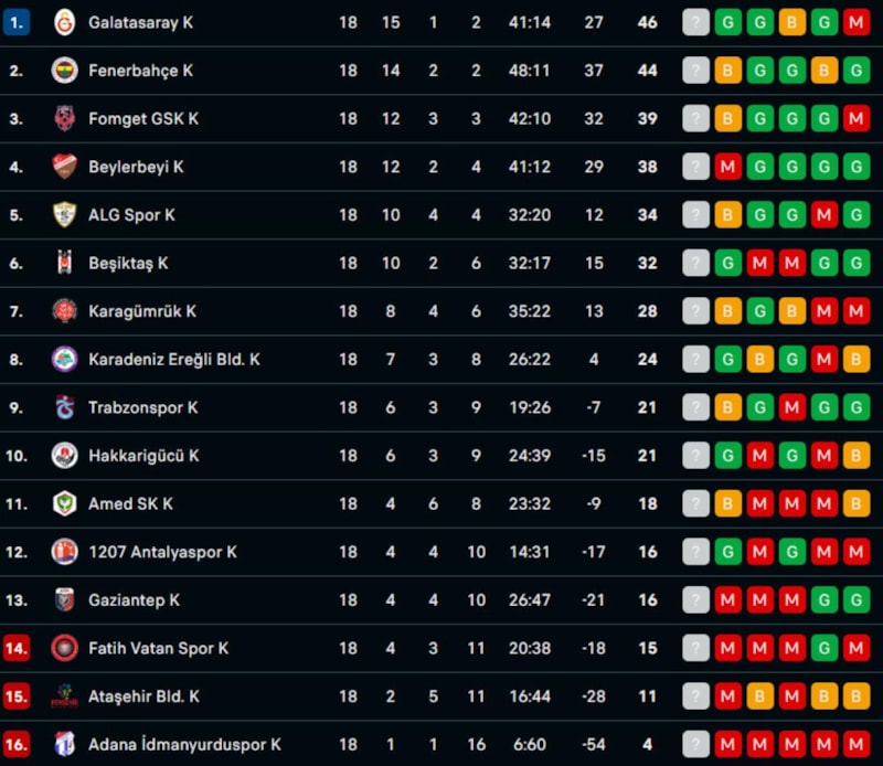 Hafta başlamadan önce 43 puan ve averajla lider olan Fenerbahçe, Ankara deplasmanında Ankara Büyükşehir Belediyesi Fomget ile 1-0 geri düşmesine rağmen 1-1 berabere kaldı ve puanını 44 yaptı.