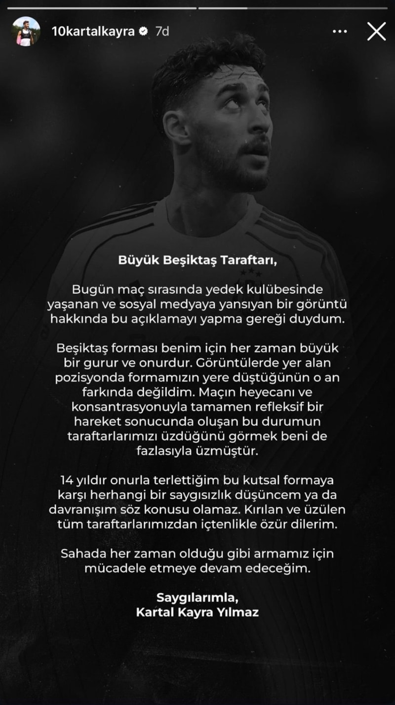 "Bugün maç sırasında yedek kulübesinde yaşanan ve sosyal medyaya yansıyan bir görüntü hakkında bu açıklamayı yapma gereği duydum. Beşiktaş forması benim için her zaman büyük bir gurur ve onurdur. Görüntülerde yer alan pozisyonda formamızın yere düştüğünün o an farkında değildim. Maçın heyecanı ve konsantrasyonuyla tamamen refleksif bir hareket sonucunda oluşan bu durumun taraftarlarımızı üzdüğünü görmek beni de fazlasıyla üzmüştür. 14 yıldır onurla terlettiğim bu kutsal formaya karşı herhangi bir saygısızlık düşüncem ya da davranışım söz konusu olamaz. Kırılan ve üzülen tüm taraftarlarımızdan içtenlikle özür dilerim. Sahada her zaman olduğu gibi armamız için mücadele etmeye devam edeceğim. Saygılarımla"