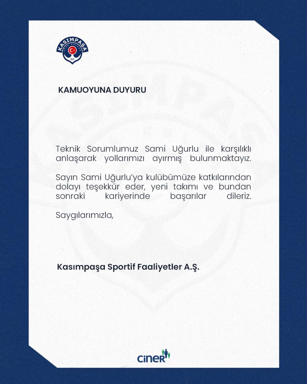 Teknik Sorumlumuz Sami Uğurlu ile karşılıklı anlaşarak yollarımızı ayırmış bulunmaktayız. Sayın Sami Uğurlu’ya kulübümüze katkılarından dolayı teşekkür eder, yeni takımı ve bundan sonraki kariyerinde başarılar dileriz.