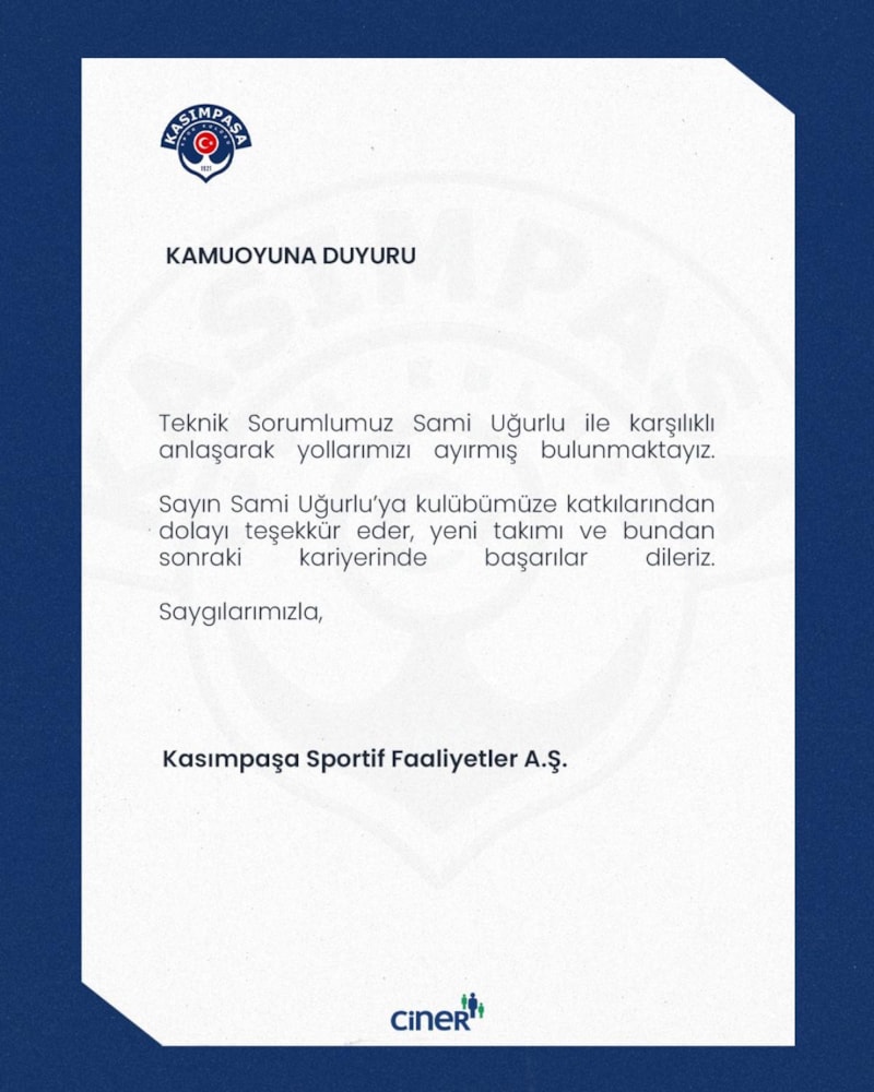 Kasımpaşa, Teknik Direktör Sami Uğurlu ile karşılıklı anlaşarak yollarını ayırdıklarını açıkladı.
